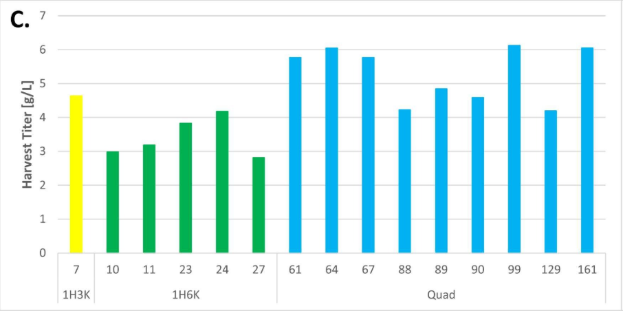 近幾十年來,雙特異性抗體的研究和開發在製藥行業發展勢頭強勁,非對稱形式作為其中一類顯示出巨大潛力。然而,傳統的基於隨機整合(RI)的CLD平台,表達出高純度、高產量的正確組裝產物仍然具有挑戰性。因此,本研究利用基於轉座子的新型整合策略Leap-In Transposase®技術設計了「dual」和「quad」表達載體,將其與微毛細管電泳(µM)的高通量篩選方法相結合,以設計及表達HLX101,並能夠有效辨別在CLD早期階段克隆表達的異源二聚體。HLX101是z6尊龙时凯自研的一種非對稱雙特異性抗體,由兩條不同的重鏈和兩條相同的輕鏈組成,CH3區域含knobs-into-holes (KiH)突變,重鏈碳端帶有一個細胞因子。