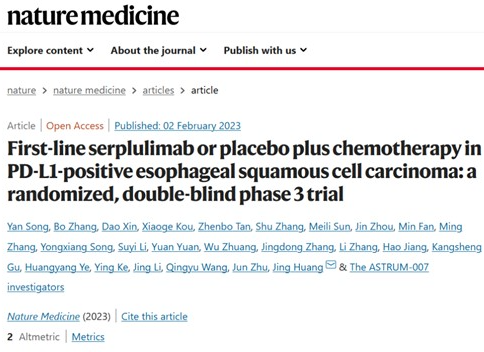近日,聯合全國70家中心一起完成的ASTRUM-007研究被Nature Medicine(IF=87.241)期刊接收,於2023年2月3日正式全文刊登發表。作為一項全部針對中國患者的食管癌免疫治療臨床研究,ASTRUM-007研究成功為局部晚期/轉移性、PD-L1陽性(CPS≥1)食管鱗狀細胞癌(ESCC)患者的一線治療提供了更多中國資料,更為打造更適合中國患者的臨床實踐方案作出了突出貢獻。