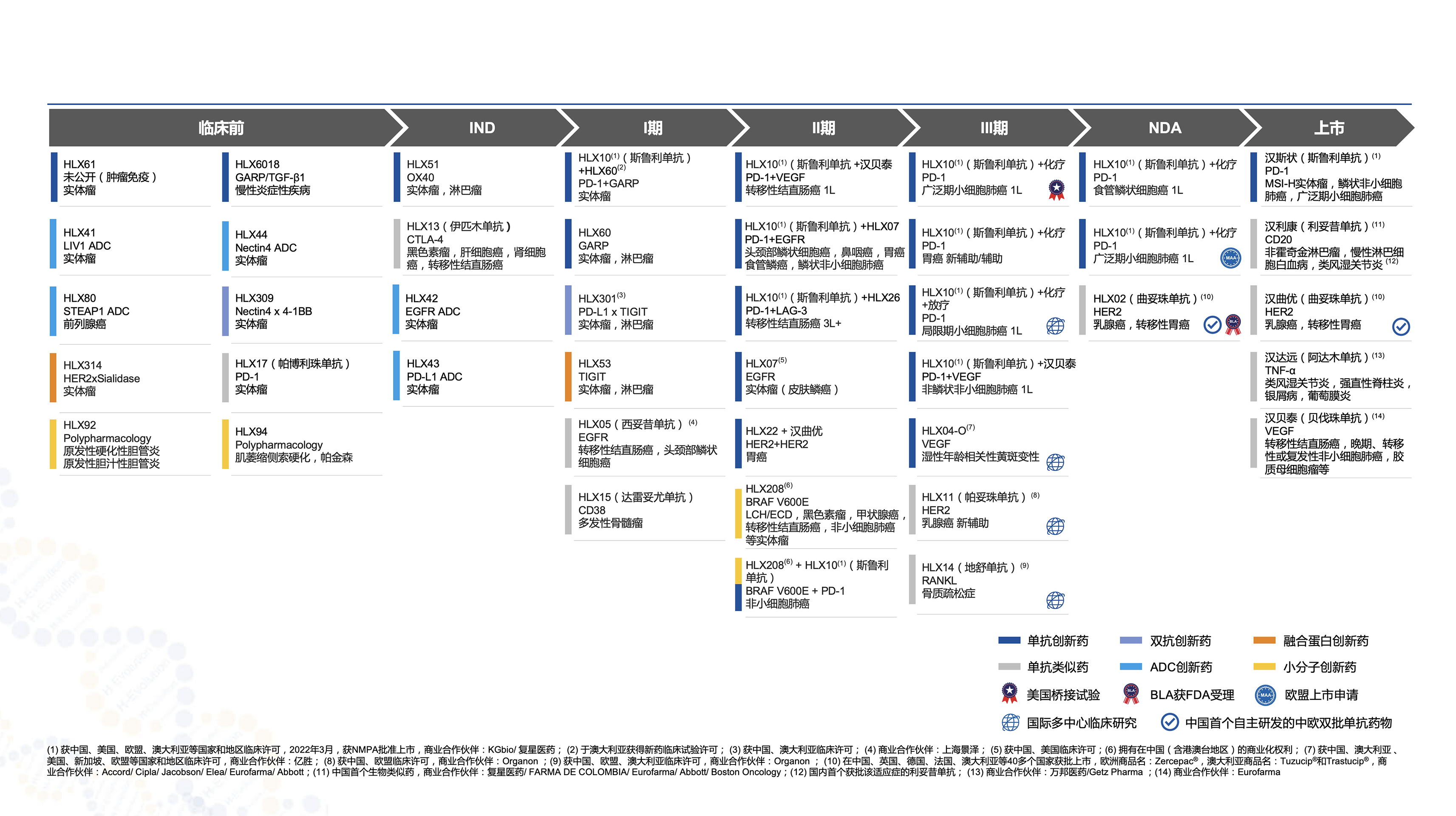 公司積極推進自主研發的HLX11(帕妥珠單抗生物類似藥)、HLX14(地舒單抗生物類似藥)、HLX04-O(抗VEGF單抗)的國際多中心III期臨床研究。2023年上半年,HLX04-O國際多中心III期臨床研究在美國完成首例患者給藥。HLX208(BRAF V600E小分子抑制劑)、HLX07(抗EGFR單抗)、HLX22(抗HER2單抗)、HLX26(抗LAG-3)等多款創新產品研究結果登上國際學術舞台。此外,公司全力推進多款潛在first-in-class產品進入臨床研究階段。抗OX40抗體HLX51用於治療晚期/轉移性實體瘤和淋巴瘤的I期臨床試驗申請於2023年上半年獲NMPA批准。2023年上半年,公司以多樣化結合子偶聯技術為突破點,加速推動和完善創新研發平台建設,依託自有ADC研發平台「漢聯」(Hanjugator),成功推進HLX42(創新型EGFR靶向ADC)和HLX43(創新型PD-L1靶向 ADC)進入臨床試驗申報階段。