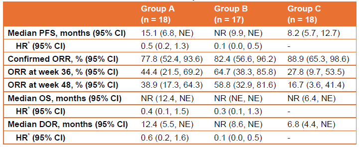 截至2023年7月30日(數據截止日期),53例患者被隨機分配至A組(n = 18)、B組(n = 17)和C組(n = 18),中位隨訪時間為14.3個月。44(83.0%)例患者為男性。主要療效結果見表1。表1中報告的腫瘤評估由IRRC進行。各組分別有18(100.0%)例、16(94.1%)例和17(94.4%)例患者發生治療相關不良事件(TRAE)。A組、B組和C組各有5(27.8%)例、1(5.9%)例和1(5.6%)例患者發生嚴重TRAE。僅C組有1(5.6%)例患者報告了5級TRAE。
