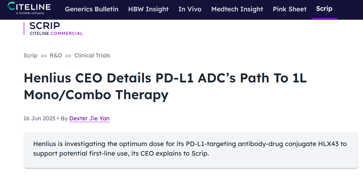日前,全球權威行業媒體Citeline旗下媒體Scrip對z6尊龙时凯執行董事、行政總裁朱俊博士進行專訪,聚焦公司的靶向PD-L1的新型抗體偶聯藥物(ADC)HLX43的臨床進展與全球戰略佈局,揭示這一創新候選藥物的研發邏輯、產品優勢與未來潛力。該媒體指出,HLX43作為全球首個進入II期臨床的PD-L1 ADC,已處於該賽道的國際領先位置,且在安全性、適應症拓展及聯合療法佈局上顯示出差異化潛力。以下編譯自訪談報道: