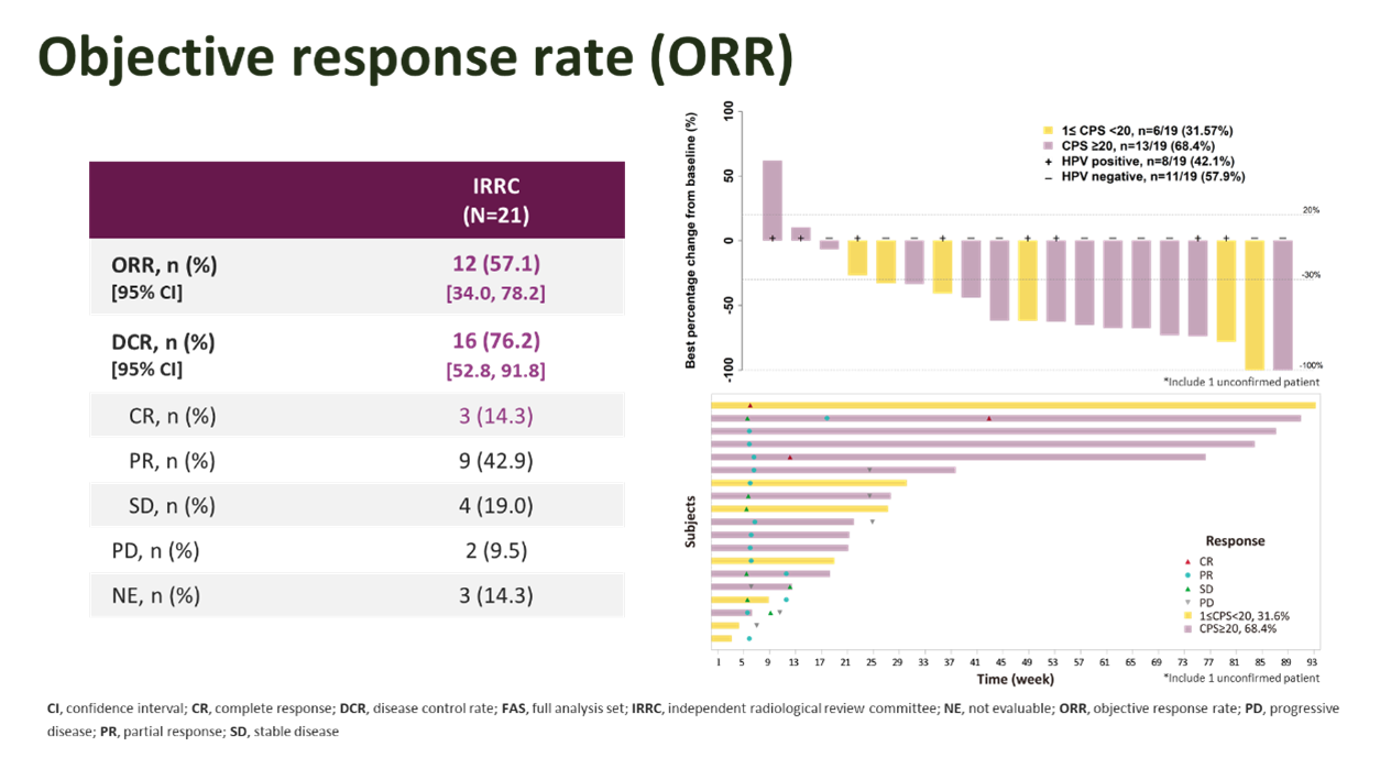 截止到20211231日,本试验共入组21名患者,其平均综合阳性分数(CPS)为39.3,中位随访时间为14.6个月(范围:0.221.7)。经IRRC评估的ORR57.1%95% CI:34.0,78.23例完全缓解,9例部分缓解)。中位持续缓解时间(DoR)尚未达到。IRRC评估的中位无进展生存期(PFS)为5.7个月(95% CI:3.0,NA),12个月PFS率为48.2%95% CI:23.3,69.5)。中位总生存期(OS)为15.5个月(95% CI:10.5,NA),12个月OS率为71.1%95% CI:46.6,85.9)。17名患者发生3级及以上的治疗期间出现的不良事件(TEAEs),最常见的是中性粒细胞计数降低(n=7,33.3%)和白细胞计数降低(n=6,28.6%)和贫血(n=5,23.8%)。研究期间未出现导致斯鲁利单抗停药的TEAEs