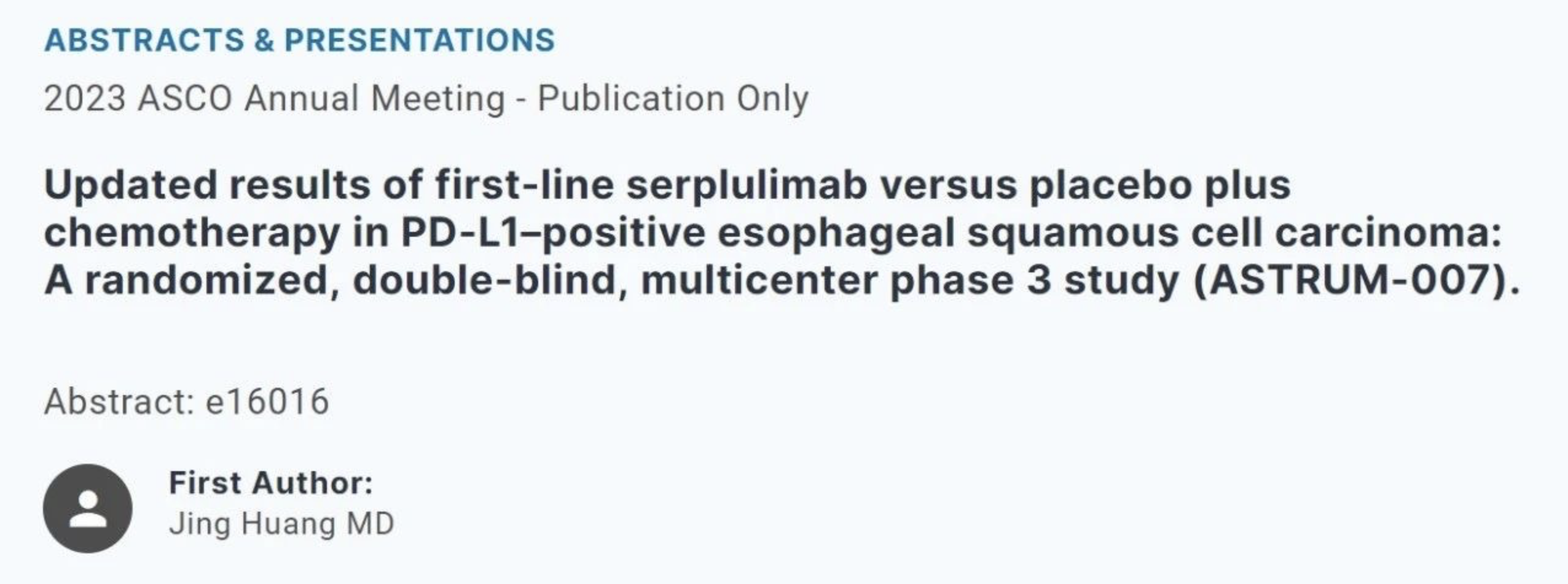 斯鲁利单抗对比安慰剂联合化疗一线治疗PD-L1阳性食管鳞状细胞癌的数据更新:一项随机双盲多中心III期研究(ASTRUM-007)(摘要编号e16016)