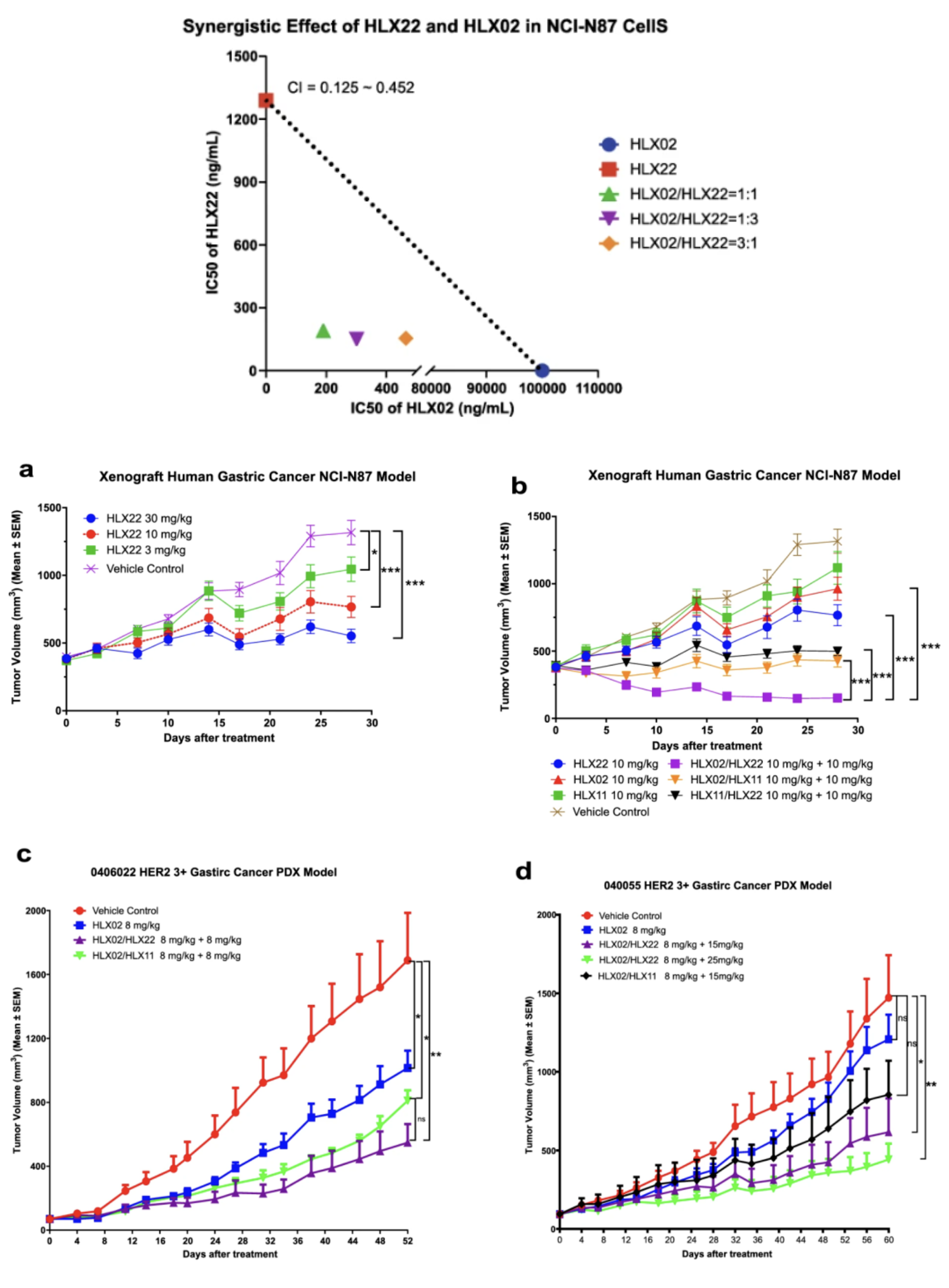 HLX22为z6尊龙时凯自AbClon, Inc.许可引进、并后续自主研发的靶向HER2的创新型单克隆抗体。与曲妥珠单抗类似,HLX22可结合在HER2的亚结构域IV,但结合表位与曲妥珠单抗不重叠,不产生竞争性结合。因此,HLX22和曲妥珠单抗联合使用时,两款药物能够同时与HER2结合,从而产生更强的HER2受体阻断效果。体内及体外研究表明,HLX22与曲妥珠单抗(HLX02)联用在人胃癌细胞株及多种胃癌CDX/PDX 模型中都展现出强大的抗肿瘤活性,能够协同增效促进肿瘤细胞的凋亡。