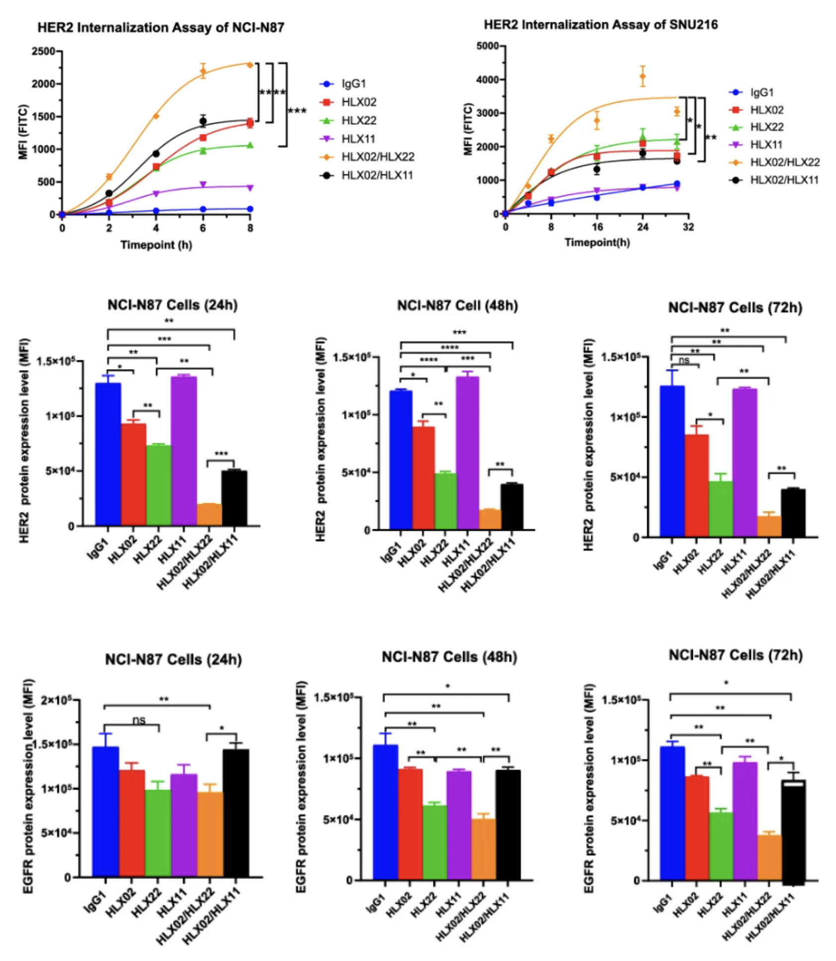 表皮生长因子受体(EGFR)家族在肿瘤发生、转移及化疗耐药性等信号传导中发挥重要作用[1]。人表皮生长因子受体2(HER2)是EGFR家族成员之一,该家族还包括EGFR(HER1)、HER3及HER4。与配体结合时,EGFR家族蛋白能够通过同源二聚化或异源二聚化,形成不同的受体复合物,进而引起胞内结构域上的蛋白磷酸化,激活细胞内信号级联通路,最终影响细胞生长、增殖、迁移和存活的各类生命过程[2, 3]。研究结果显示,当HLX22和曲妥珠单抗(HLX02)共同作用于HER2的亚结构域IV时,可以同时促进 HER2/HER2 同源二聚体和 HER2/EGFR 异源二聚体的内吞作用,将HER2的内吞提高40-80%。相较而言,帕妥珠单抗会抑制HER2的异源二聚化,因此曲妥珠单抗和帕妥珠单抗的联用仅能促进HER2/HER2同源二聚体的内吞,而无法促进HER2/EGFR异源二聚体的内吞。这或许也是导致曲妥珠单抗与帕妥珠单抗这一双靶向疗法未能在HER2阳性胃癌临床研究中取得疗效的原因。