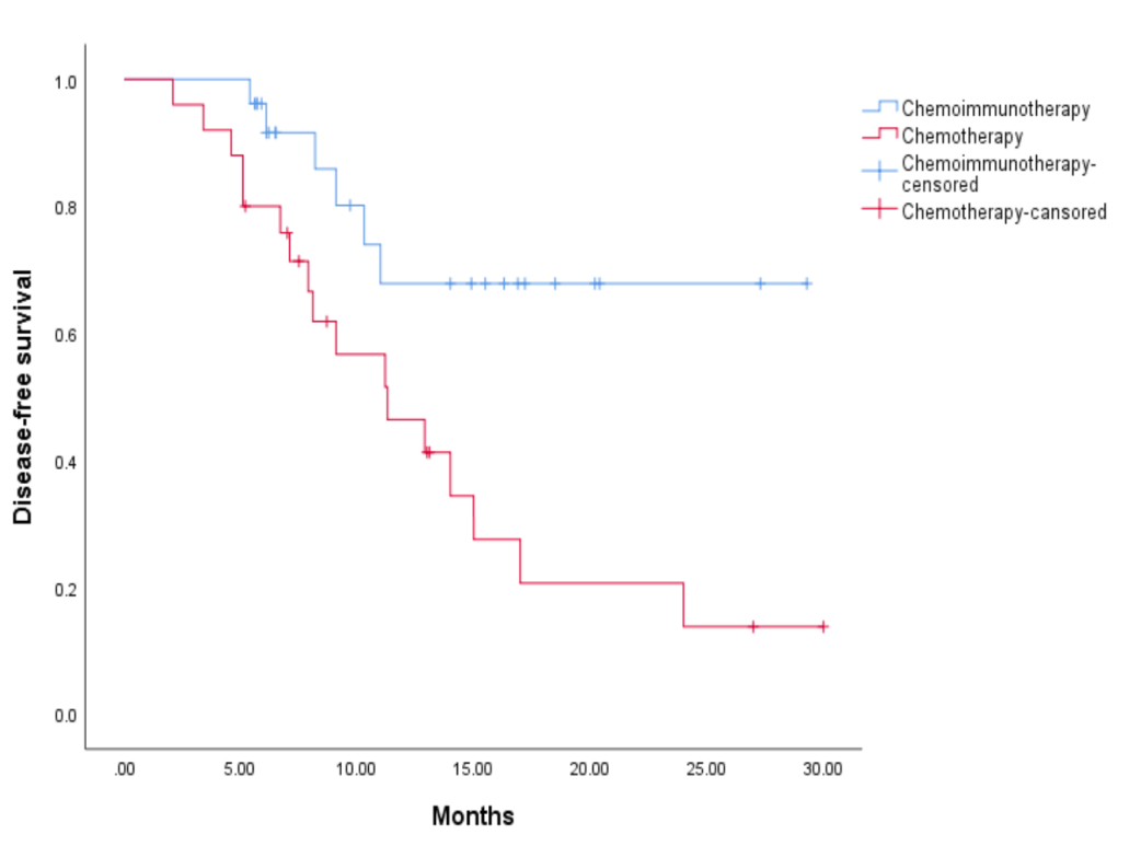 疗效数据显示,免疫联合化疗组和化疗组的pCR分别为 38.5%和 8.0%(OR 7.2,95% CI:1.4~37.3)。免疫联合化疗组和化疗组的MPR分别为 53.8%和12.0%(OR 8.6,95% CI:2.0~35.8)。免疫联合化疗组和化疗组R0切除率分别为92.3%和80.0%(OR 3.0,95% CI:0.5~17.2)。免疫联合化疗组较化疗组的病理降期率(88.5% vs 36.0%)和N2降期率(68.2% vs 24.0%)均提升(表2)。中位随访时间为17.2个月,免疫联合化疗组的中位DFS尚未达到,化疗组的中位DFS为11.3(95% CI:6.1~16.5)个月。
