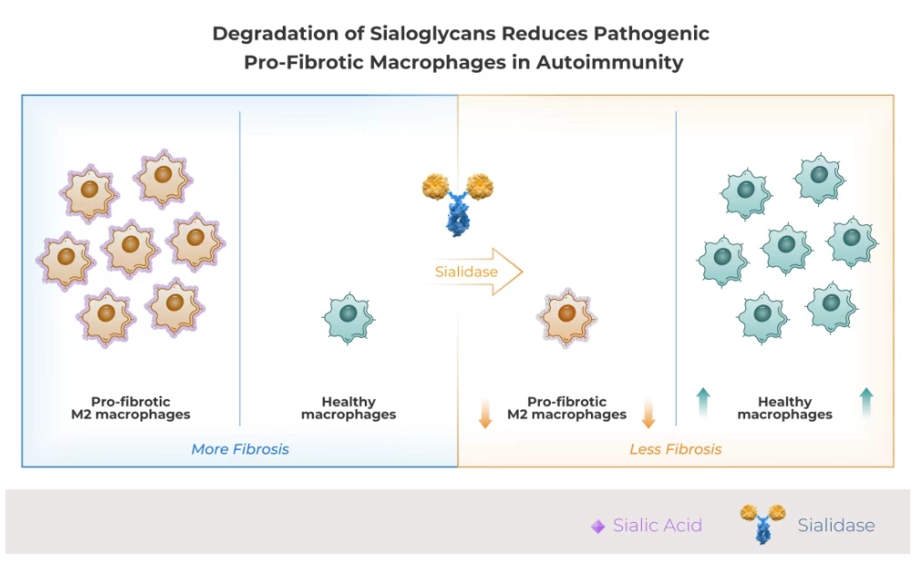 HLX79是基于Palleon的EAGLE糖编辑平台开发的潜在“同类首创”的人唾液酸酶融合蛋白。HLX79 通过酶解唾液酸糖苷,从而增强对两类在自身免疫疾病中高度致病的免疫细胞的清除:一是驱动炎症的自身反应性记忆B细胞,二是促进纤维化和器官损伤的M2型巨噬细胞。