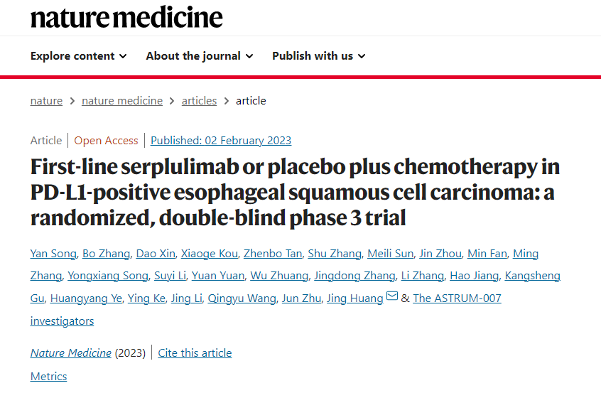 On February 3, 2023 (UTC +8), the results of ASTRUM-007, Henlius’ phase 3 clinical study of anti-PD-1 mAb HANSIZHUANG (serplulimab) plus chemotherapy as first-line treatment for patients with PD-L1 combined positive score ≥1 esophageal squamous cell carcinoma (ESCC), were published in the international leading journal Nature Medicine (impact factor 87.241). The leading principal investigator of ASTRUM-007 was Professor Jing Huang from National Cancer Center/National Clinical Research Center for Cancer/Cancer Hospital, Chinese Academy of Medical Sciences and Peking Union Medical College.