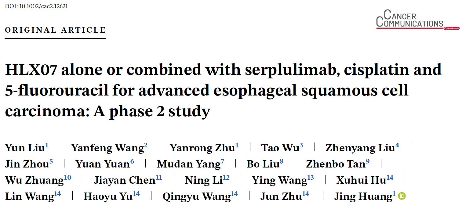 [5] Liu Y, Wang Y, Zhu Y, et al. HLX07 alone or combined with serplulimab, cisplatin and 5-fluorouracil for advanced esophageal squamous cell carcinoma: A phase 2 study. Cancer Commun (Lond). Published online October 24, 2024. doi:10.1002/cac2.12621
